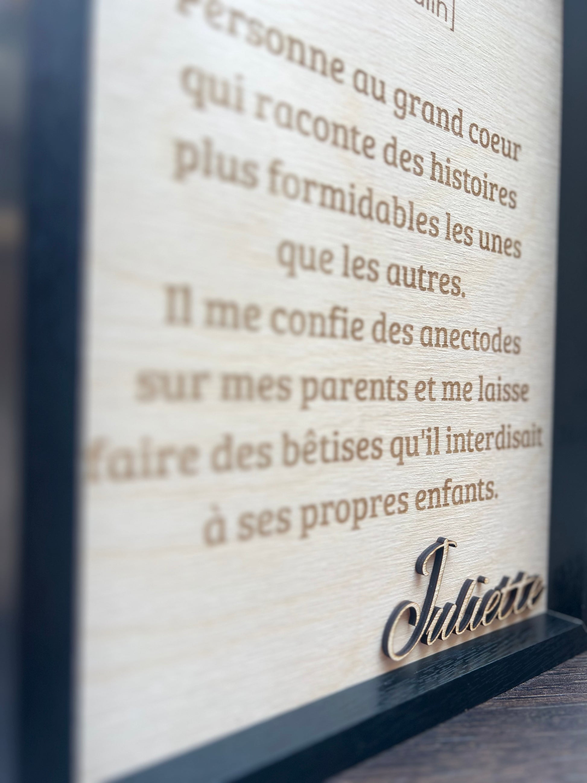 Voici un cadre gravé unique où vous pouvez choisir le texte qui vous fait sourire ! Parfait pour offrir à Papy, ce cadre rigolo immortalise vos mots avec une touche personnalisée pleine d'humour. Un cadeau original pour faire fondre son coeur tout en lui arrachant un éclat de rire.