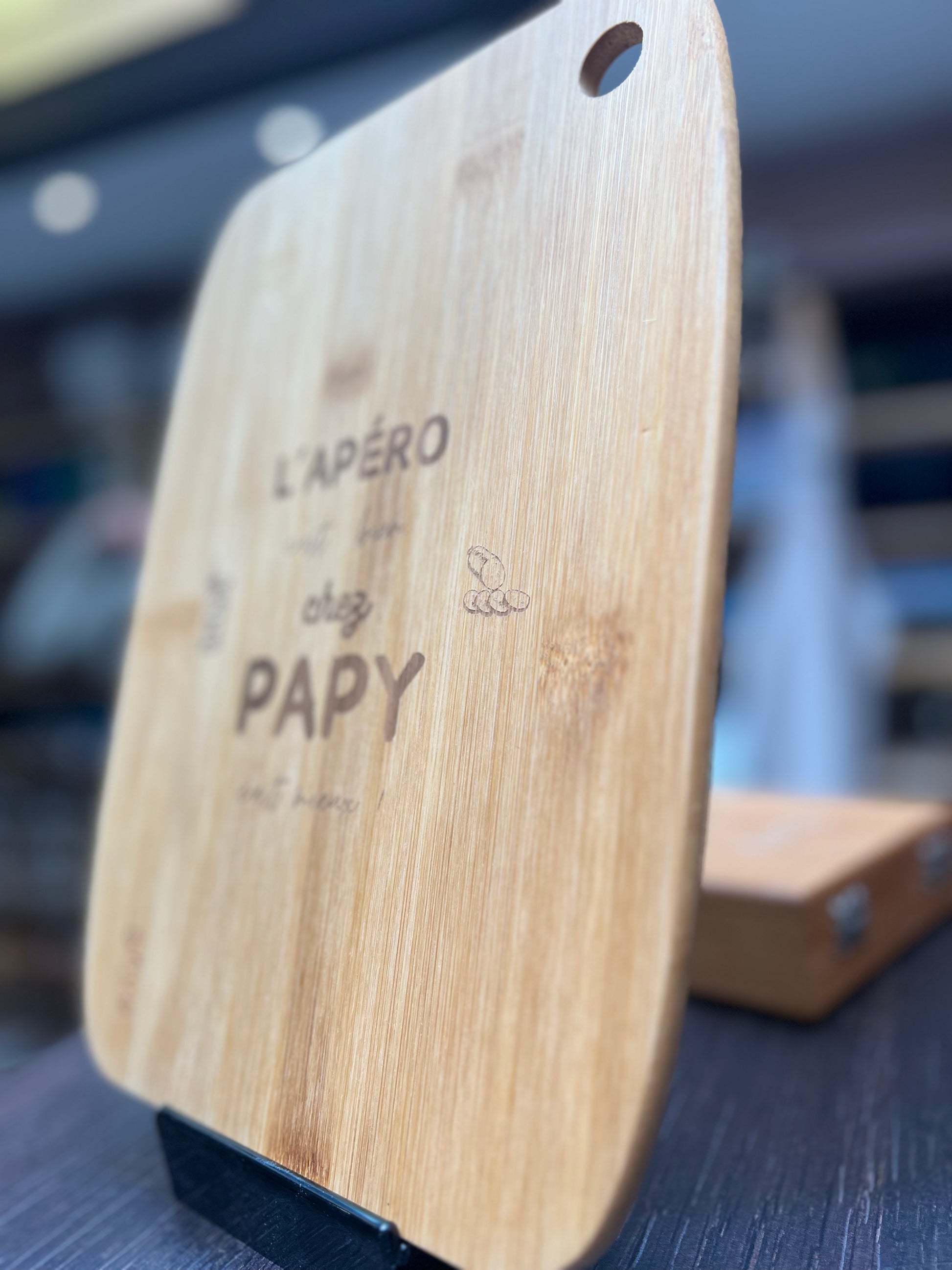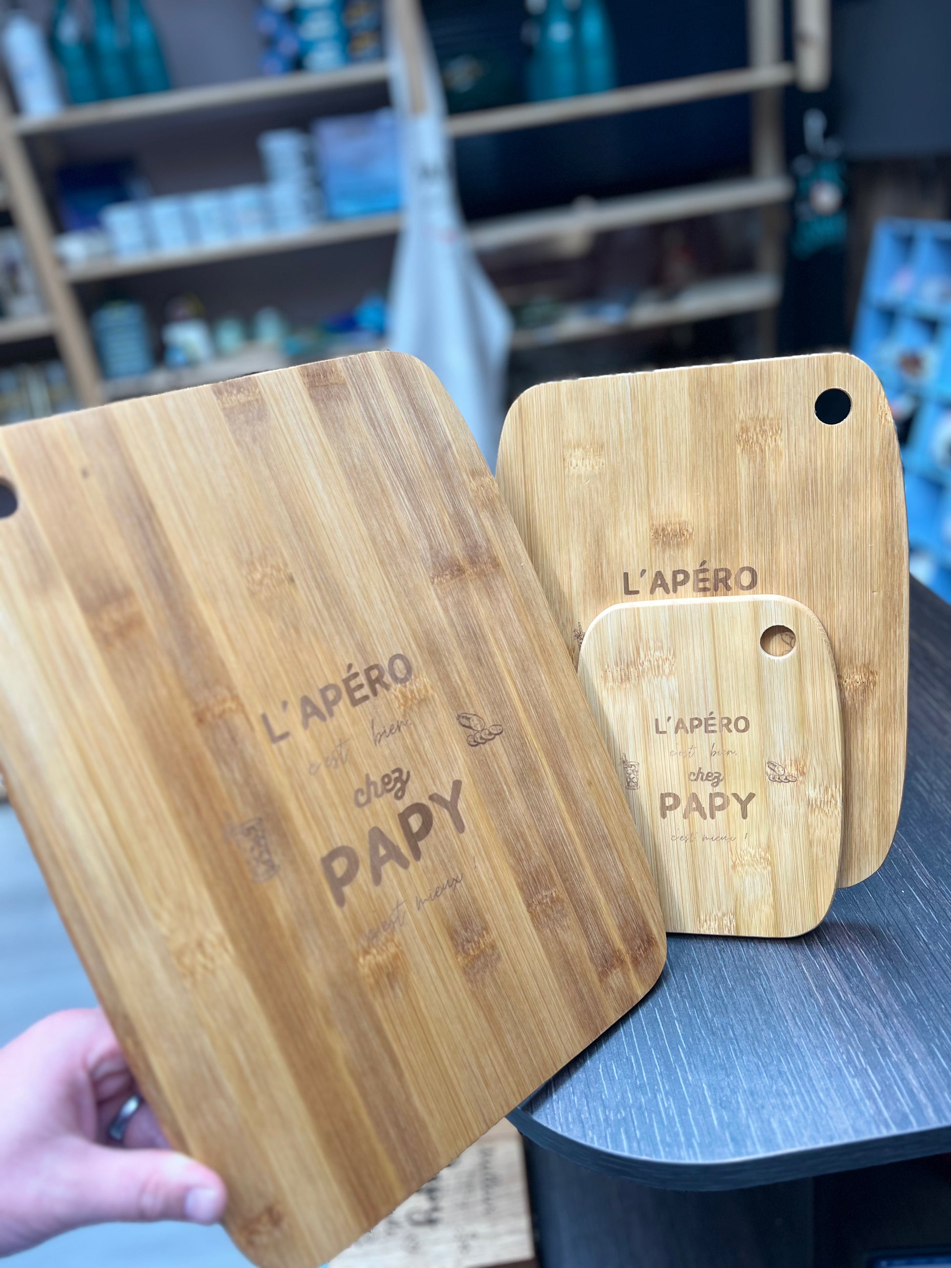 Découvrez la planche à découper "Papy" en trois tailles : petite (19x14 cm), moyenne (29x22 cm) et grande (37x28 cm). Personnalisez la planche avec le texte et les motifs de votre choix